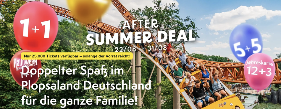Mit dem After Summer Deal sicherst du dir unglaubliche Rabatte auf Tickets und Jahreskarten für das Plopsaland Deutschland, Plopsaland Belgien und für viele weitere Plopsa-Parks! Jetzt direkt die besten Deals sichern, da das Kontingent begrenzt ist.